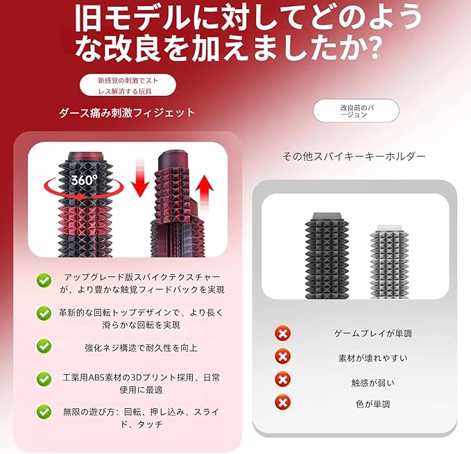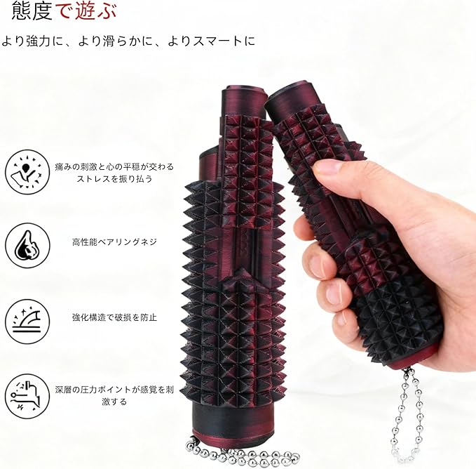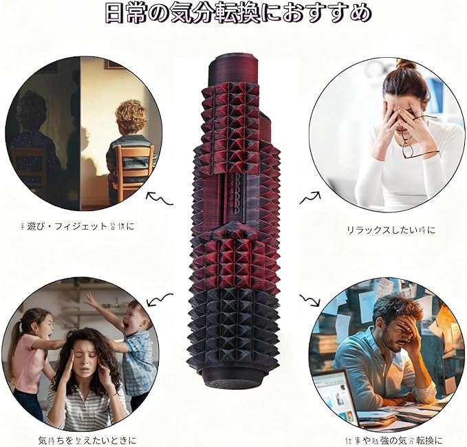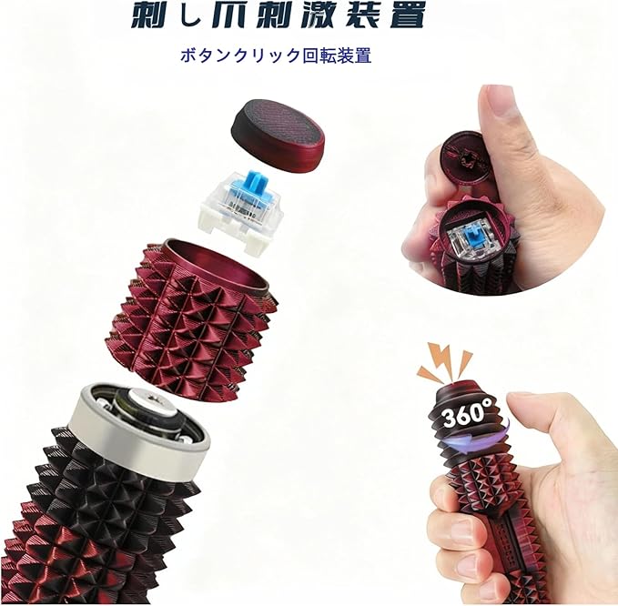1️⃣ トゲ付きグリップで刺激を楽しむ独自デザイン 外側に配置されたトゲ付きグリップが、指先に軽い刺激を与え、触覚的なリフレッシュ感を楽しめます。仕事や勉強の合間に使うことで、気分を切り替えやすく、集中力を保つサポートにもなります。