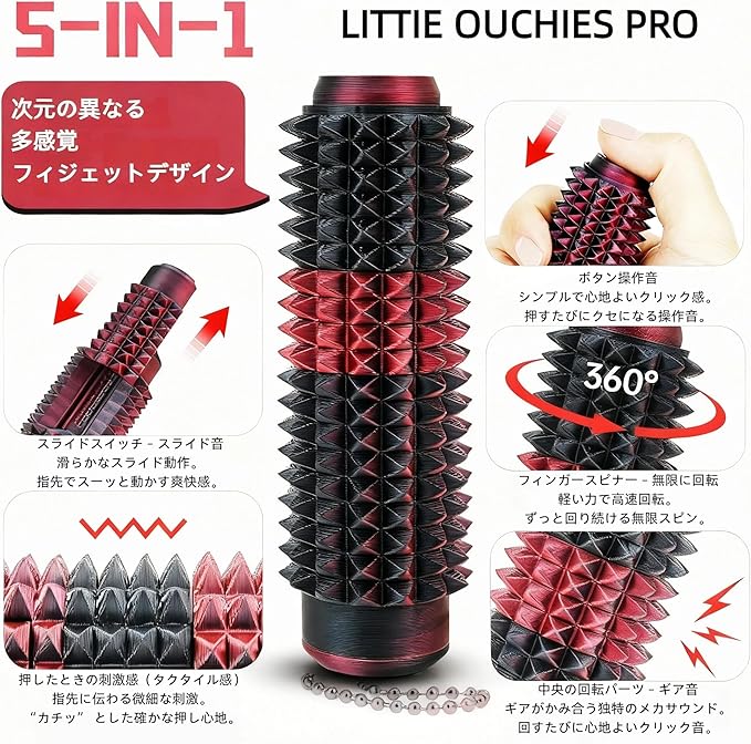 刺す感覚ストレス解消玩具——カチカチ音・回転器・スライダー・ローラー・トゲトゲグリップ付き痛覚刺激ツール | 5-in-1多機能ストレス解消、脳トレ 集中力 不安 緊張 解消 気分転換 リラックス 指体操 気分転換 休暇 ポータブル(赤黒-レーザー)