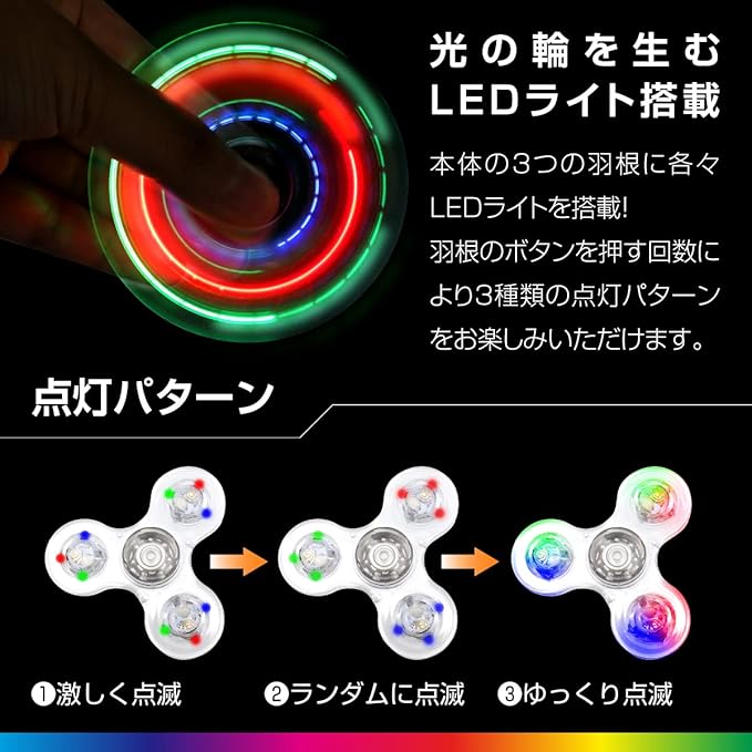 本体の3つの羽根にはそれぞれLEDライトが搭載されています。羽根のボタンを押し込むことで、LED照明が点灯し光りながら回転します。また、ボタンの押す回数によって3種類の点灯パターンをお楽しみいただけます。それぞれの羽根の点灯パターンを変えてお好みの光り方を見つけてみるのも面白いです。【点灯パターン】①激しく点滅②ランダムに点滅③ゆっくり点滅