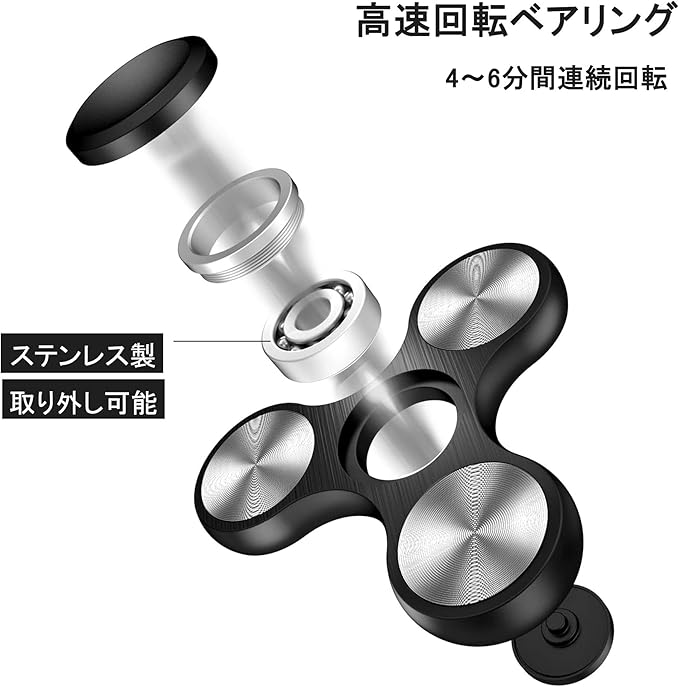 【優れたベアリング よく回る】ハンドスピナーの内部軸受は、耐久性、耐摩耗性、潤滑性に優れたR188ステンレス製静音ボールベアリングで、長時間回転可能で、通常4~6分回転させることができる。