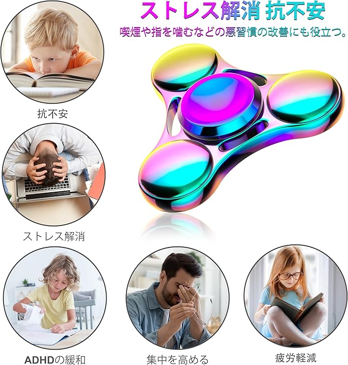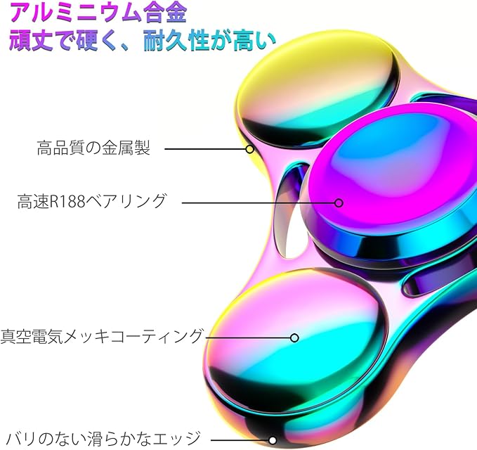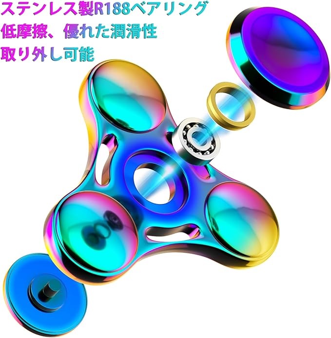 【高品質の金属合金製】ハンドスピナーは高品質の金属合金で作られており、真空電気メッキコーティングは色あせしにくく、色鮮やかです。優れた職人技により、スピナーの表面は滑らかでバリがなく、耐久性、耐摩耗性、無毒性、長寿命、手触りが非常に快適です。重量感があり、高級感があり、手触りも抜群です。