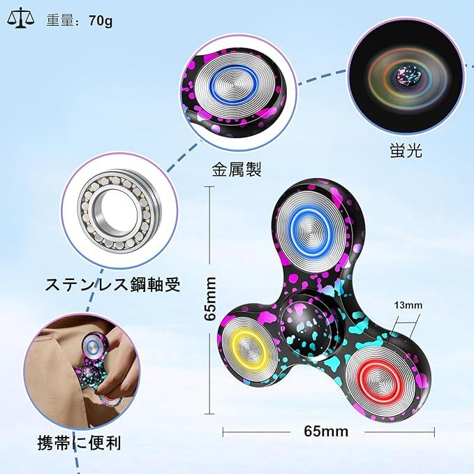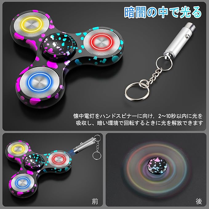 暗闇で発光:懐中電灯をハンドスピナーに当て、2~10秒間光を吸収させると、暗い環境で回転させた際に光を放出し、クールな視覚効果を演出します。注意事項:懐中電灯やその他の光源で照射して光を吸収させることで発光し、照射時間が長いほど、発光持続時間も長くなります。