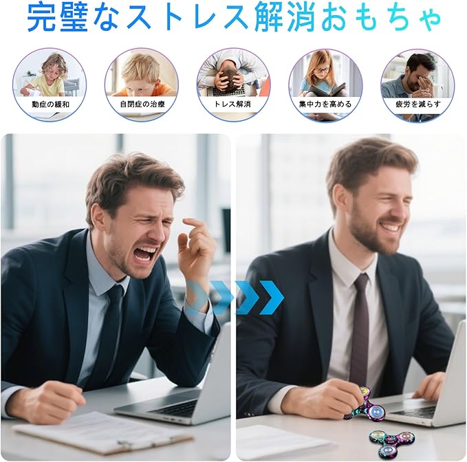 完璧なストレス解消 グッズ:回転させることで、退屈な時間を過ごしたり、楽しみを味わったりすることができ、さらに注意力を高めたり、深く思考に耽ったりするのにも助けとなります。不安を和らげる効果があり、自閉症やADHD(注意欠陥多動性障害)の症状緩和にも役立ちます。