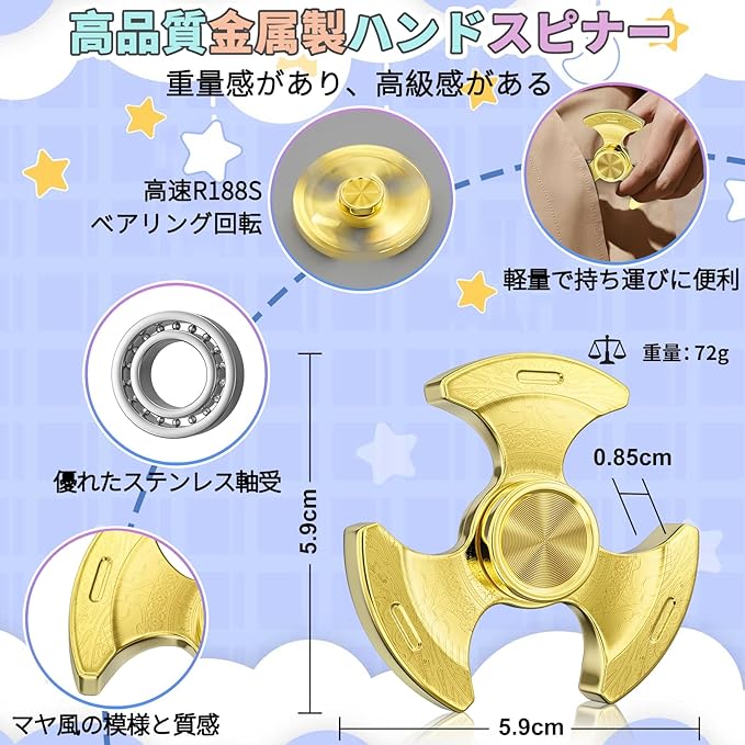 【特別デザイン】:ユニークなレトロな模様,不規則な形状を組み合わせ、ユニークな新作スピナー玩具を創り出しました。ハンドスピナーは高品質の金属合金で作られており、真空電気メッキコーティングは色あせしにくく、色鮮やかです。優れた職人技により、スピナーの表面は滑らかでバリがなく、耐久性、耐摩耗性、無毒性、長寿命、手触りが非常に快適です。重量感があり、高級感があり、手触りも抜群です。