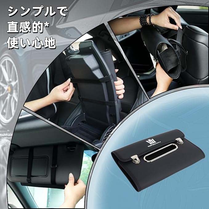 【取り付け簡単】この 車 ティッシュホルダーは調節可能なゴムバンドを背面に2つ装備。多くの車種のサンバイザー に簡単に装着可能。さらに水平ゴムバンドを同梱し、ヘッドレストやサイドアームレストなどにも対応可能。金属製のクリップ式に比べ、本製品のゴムバンド式は長期間取り付けてもご愛車の内装を傷つけません。