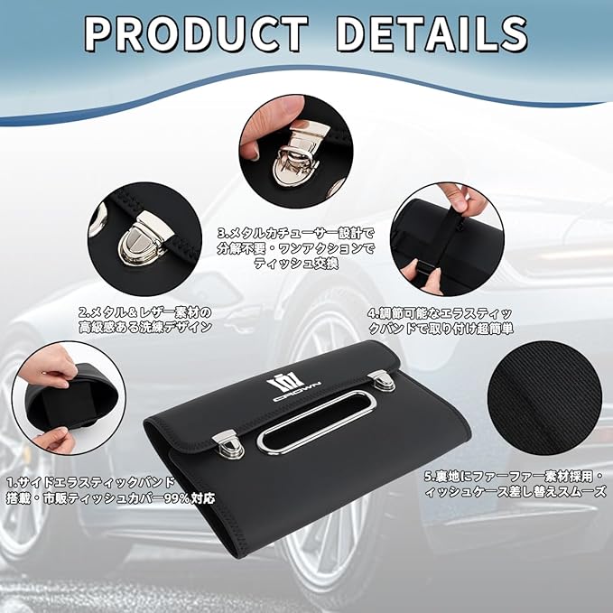 【高品質材質】高品質レザー素材を使用しており、豪奢な雰囲気を醸し出しながら、独特な質感も備えています.裏面にはフランネル裏地のデザインを採用し、柔らかい手触りがレザー材質と組み合わせ、独特な高級感を醸し出します.側面に伸縮性ゴムバンドを採用、幅調節可能、市販のティッシュボックスの99%にフィットする。防水性に強く、水にあっても心配不要で.汚れた場合でもウェットティッシュで拭くだけで綺麗になります.