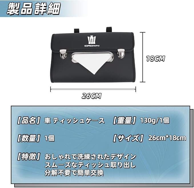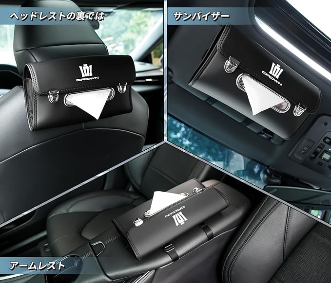 【専用ロゴ】この車用ティッシュケース表面は Crown 専用ロゴが印刷されており、ご愛車に合わせやすい洗練なデザインが特徴です、車内に高級感を与えます。クラウン 車のカスタムパーツおしゃれ。