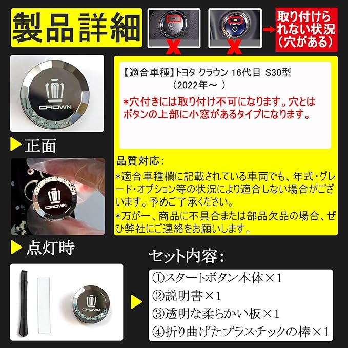 【注意すること】①適合車種欄に記載されている車両でも、年式・グレード・オプション等の状況により適合しない場合がございます。予めご了承ください。記載のデザイン・形状をお取り付けを行う車とよくご確認の上、お買い求めください。②車検規定に適合しているかどうかはわかりません。車検、ディーラー持込の際は元のボタンに戻し、車検合格後にこのものを装着することをお勧めします。③問い合わせが多い場合は電話が繋がらない場合があります。何卒ご了承くださいませ。その場合は、メールから問い合わせてください。