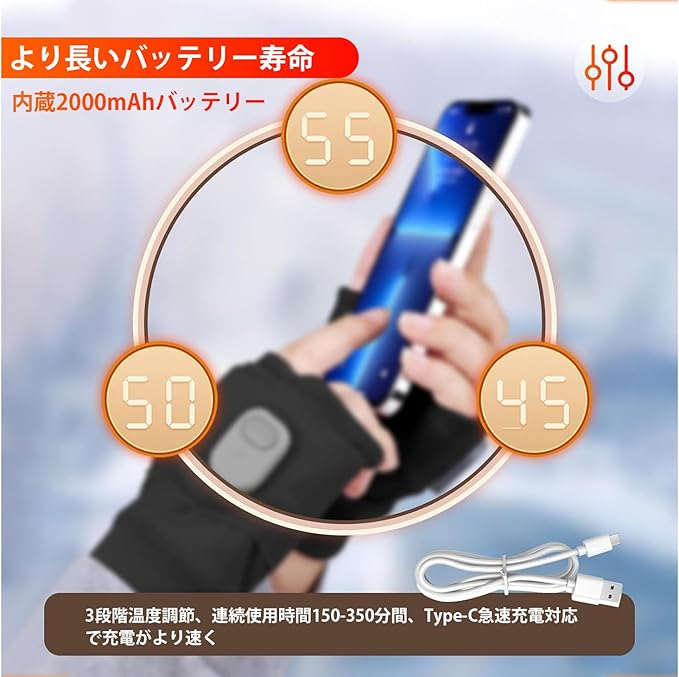 【超長持ち手を温めるグッズ】:この充電式電熱手袋は高品質2000mAhバッテリー搭載し、フル充電後180~350分の快適な暖かさを提供します。ボタン一つで3段階温度設定(45 C/50 C/55 C)を切り替え可能!
