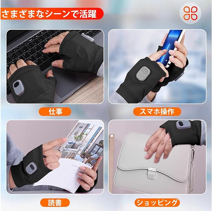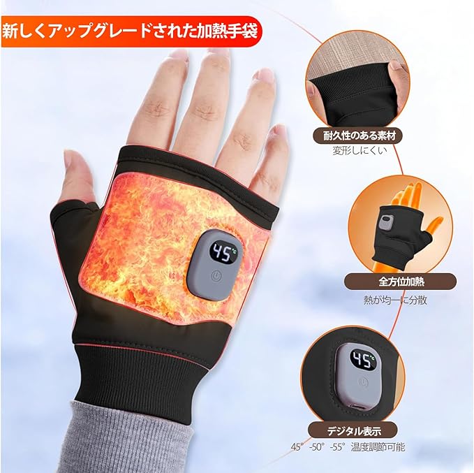 【デジタル表示付きポータブル指なし電熱グローブ】:従来の電熱充電式手袋とは異なり、この充電式ヒーター手袋は指出しデザインを採用しており、手袋を脱がずにスマートフォンやその他の電子機器を簡単に操作可能。製品は防風袖口付きで、360 全方位加熱により、手のひら全体を均等に温めます。