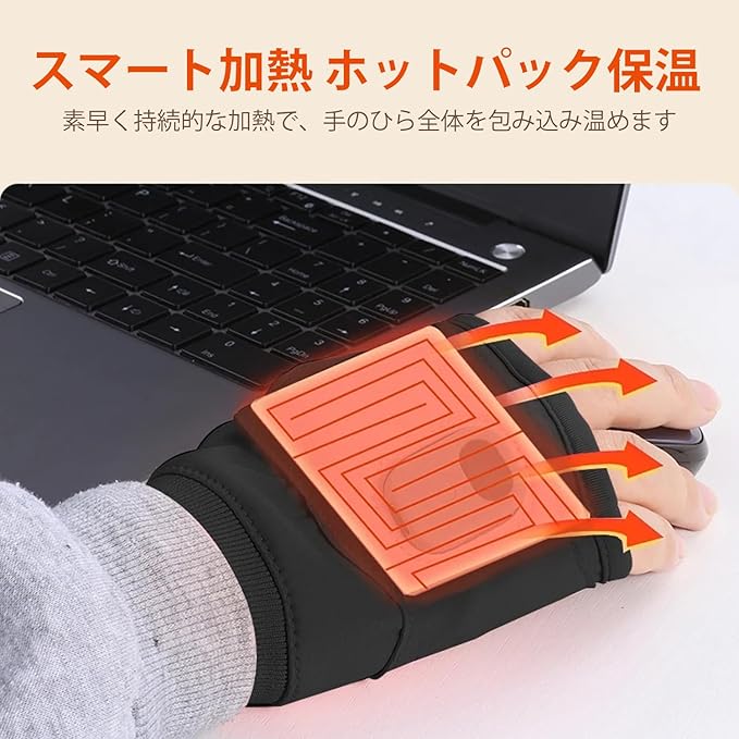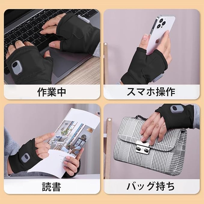 【快適で実用的なデザイン】この電気手袋は360 ラップアラウンド型の発熱体を備え、手のひら、指、手の甲まで均一に熱を分散します。ハーフフィンガーデザインにより、指を自由に動かしてタイピングやスマートフォンの操作などが行え、多機能性を提供しながらも暖かさを損ないません。