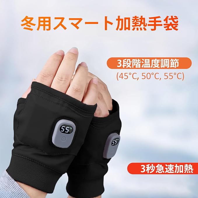 【スマート加熱技術】電熱手袋はスマート恒温制御を採用し、3段階調節可能な温度設定(45 C、50 C、55 C)を備えています。ディスプレイ付きで温度を確認でき、寒い天候でも手を温かく快適に保ちます。USB充電設計で手軽に充電でき、手軽に持続保温。寒い天候やアウトドア活動などに最適です。