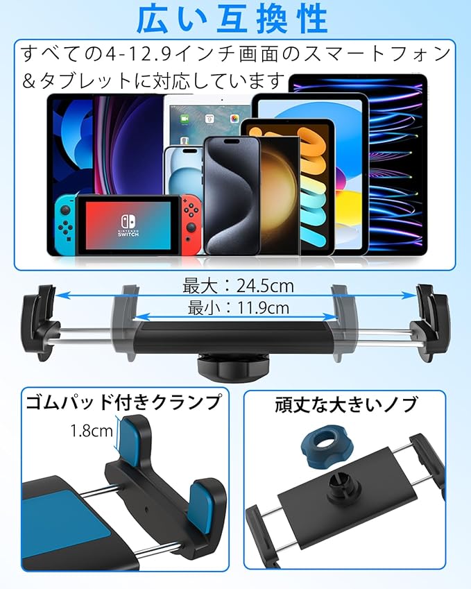 【多機種対応】このタブレットとスマートフォンアームスタンドは伸縮幅サイズが12〜25cmで、すべての4〜13インチのデバイスに適合します。対応タブレット:iPad Pro 9.7 / 10.5 / 11 /12.9 インチ、iPad Air 2、Air 3、Air 4、iPad Mini 1/2/3/4/5、iPad(第9世代)/8/7/6/5。対応携帯電話:iPhone 14、14 Pro、14 Pro Max、13 Pro Max、13 Pro、13、12、11、Xs Max、XR、XS、X、8 Plus、8、7 Plus、7、6 / Galaxy Tab / Galaxy Note / Galaxy S21、S20、S10 / HUAWEI。