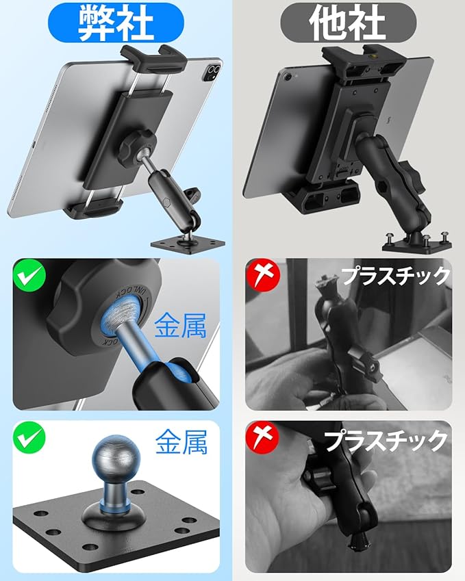 【金属製ベース】タブレット車載ホルダーは、頑丈な金属製ベースを採用しており、プラスチック製ベースよりも耐久性が高く、安定性があります。