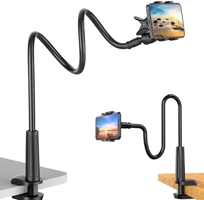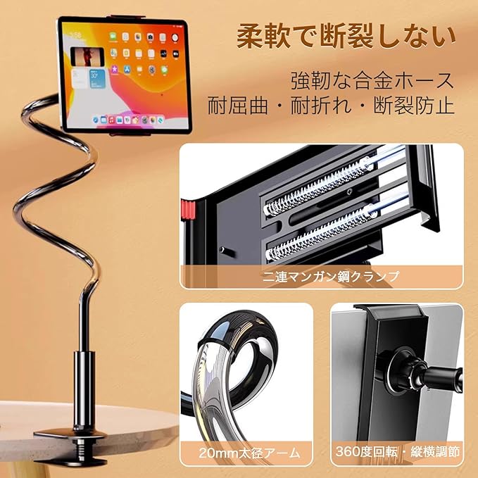 【ガチョウの首スタンド】スマホスタンドは柔軟なホース採用されて、業界最も科学的な80cmになり、ガチョウの首のように自由に回転します。先端部のフレキシブルアームで自在に微調整できるので、ベストなポジションの調整ができます。