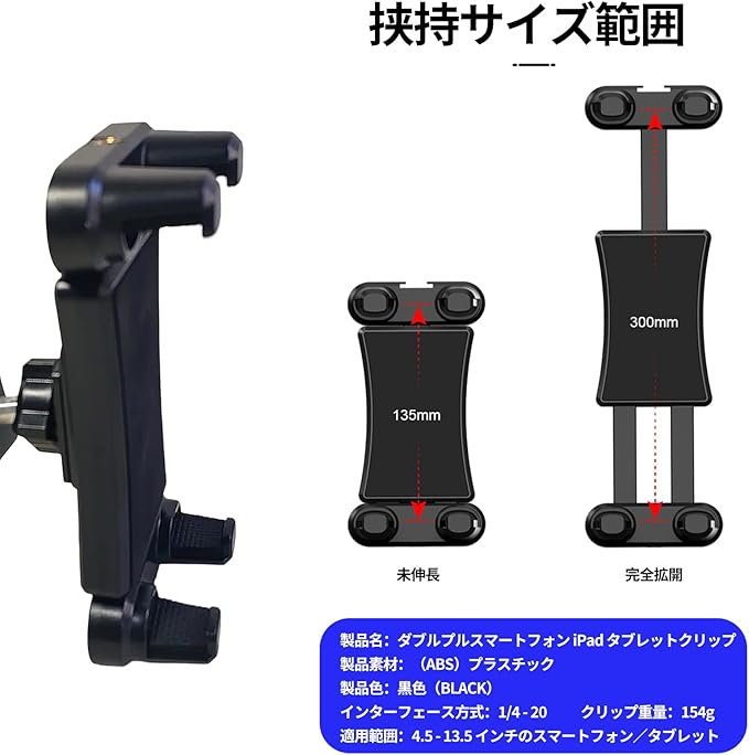 【幅広いデバイス対応】4.5インチのスマートフォンから13インチのタブレットまで、さまざまなサイズの端末を安定して保持。強化されたクランプと軟質パッドで、機材を傷つけずにしっかりとサポートします。