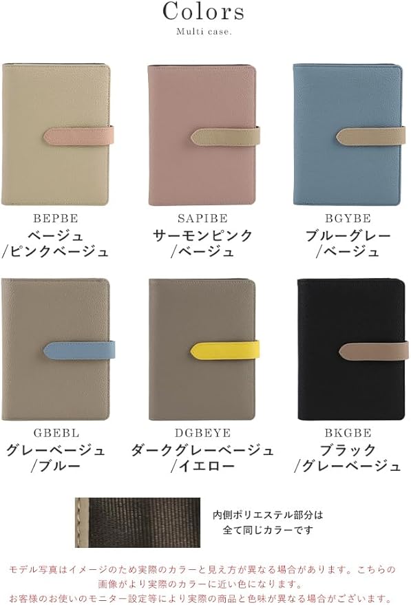 計16ポケットあり、見た目以上の大容量なので 用途に応じてたっぷり収納できる。 見開きで一目で中身を見渡せるから どこにあるのかわかりやすく取り出しもスムーズ! シンプルながらベルト部分には本革を使用し、 配色デザインが大人可愛く上品な印象に。
