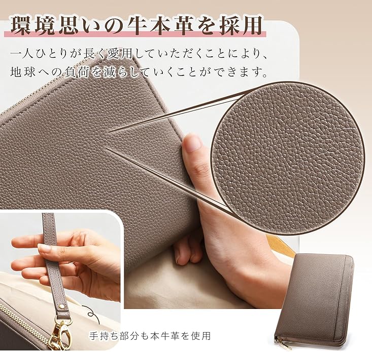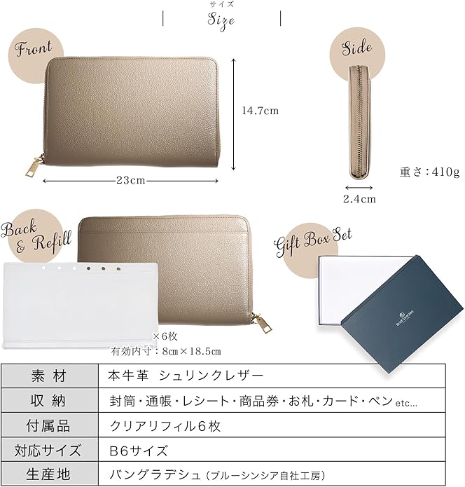 ✅【 サイズ 】縦14.7 横23 厚み2.4cm リフィル有効内寸:8 18.5cm(通帳1冊や1万円紙幣の入るサイズです)【 素材 】牛本革 シュリンクレザー【 カラー 】ロイヤルブラック・レトロキャメル・ダークネイビー・エトープ・ディープグリーン・グレージュ・スカイブルー・スワニーピンク