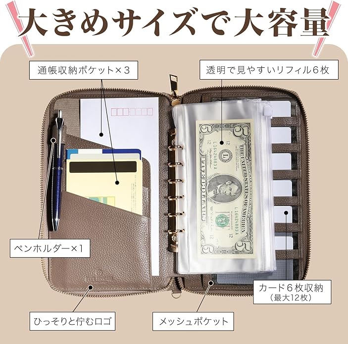 ✅【バラバラ管理を1つにまとめてスッキリ収納】家計の袋分け収納や母子手帳ケース、パスポートケースなど様々なシチュエーションで大活躍!透明で見やすい6枚のリフィル付きだからお札や、薬の保管にも便利です。コインの収納はファスナー付きのメッシュポケットに。これ1つで身の回りの整理はバッチリ!