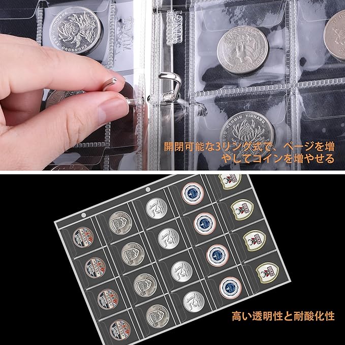コイン用ポケットは2種類:コインコレクションバインダーには、ペニー、クォーター、シルバーイーグル、シルバーゴールドドル、ハーフドル、シルバー地金、チャレンジコインなど、15ページのプラスチックシートが付いています。コインブックには260個のポケットがあり、20mm~38mmのコレクターコインを収納できる大容量です。10ページのコインコレクションページには30mmコイン200枚、5ページのコインコレクションページには38mmコイン60枚が収納できます。30mmポケットのサイズは約33mm 36mmです。 38mmポケットは約45cm 45cmです。