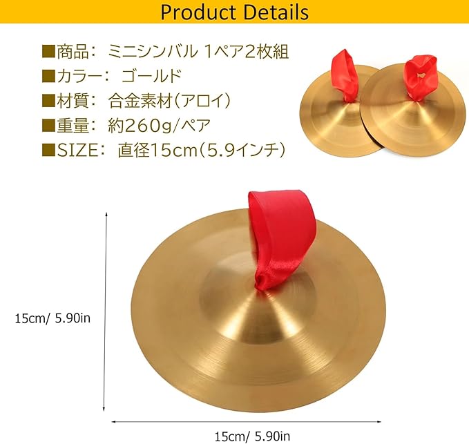 商品詳細: ミニシンバル 1ペア2枚組 【カラー】 ゴールド 【材質】 合金素材(アロイ) 【重量】 約260g/ペア 【サイズ】 直径15cm