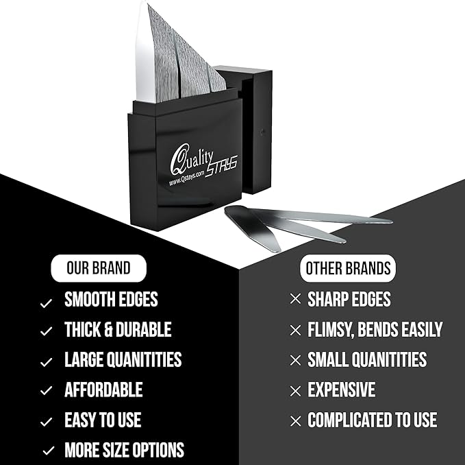 ステンレススチール - ステンレススチール製のカラーステーは長持ちするように作られています。 シャツに付属する薄っぺらなカラーステーとは異なり、この430グレードの硬いカラーステーは、錆びたり、曲がったり、壊れたりしません。