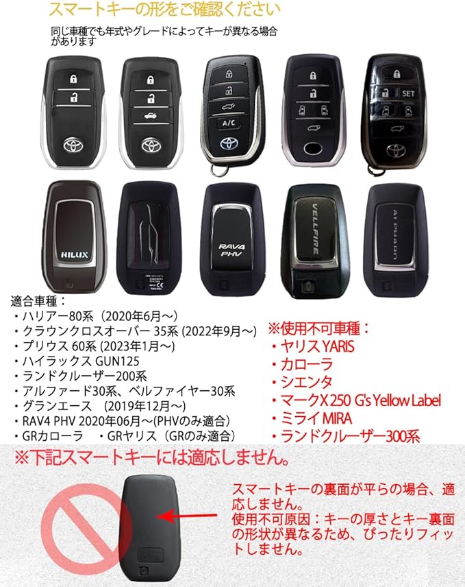 ✅【適合車種】 クラウン クロスオーバー 35系(2022年9月~)、 ハリアー 80系 、 プリウス 60系 、 ハイラックス GUN125 ランドクルーザー200系 、 RAV4 PHV 2020年06月~(PHV版RAV4のみ適合) グランエース (2019年12月~)、 アルファード ヴェルファイア 30系 前期 2015年(平成27年)1月~ 後期 2018年(平成30年)1月~、GRカローラ 、GRヤリス など 【※使用不可車種】:ヤリス YARIS カローラ シエンタ トヨタ ミライ MIRAI MARK X マークX G's Yellow Label ランドクルーザー300系。使用不可原因:キーの厚さとキー裏面の形状が異なるため、ぴったりフィットしません。