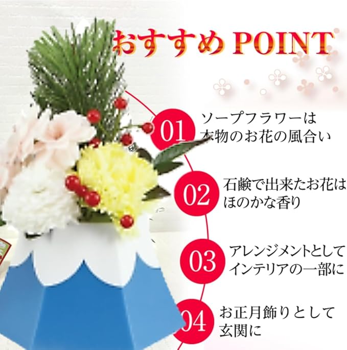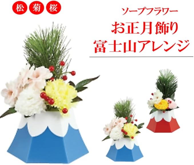 ソープフラワーの富士山、初日の出をイメージしたアレンジメントの松飾りです。おめでたい松や菊、赤い実が入った縁起の良い卓上正月飾りです。フレグランスフラワーとして、ほんのり石鹸の香りもお楽しみいただけます。