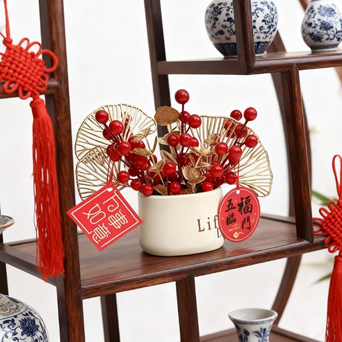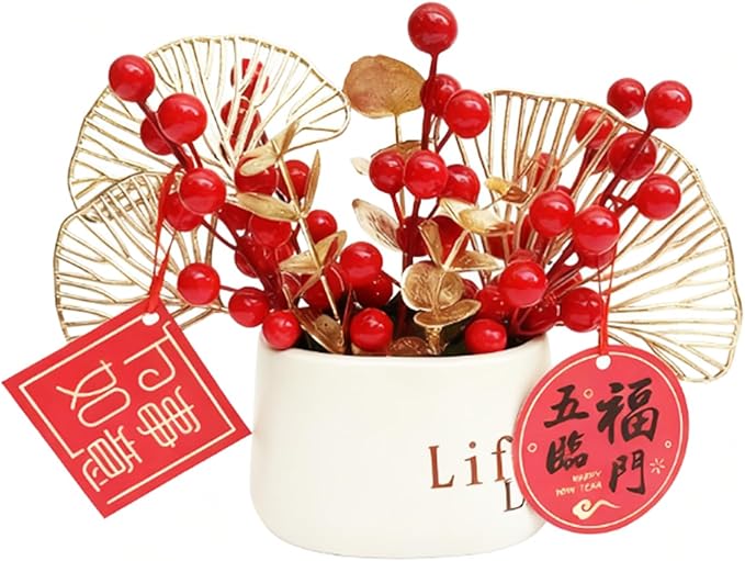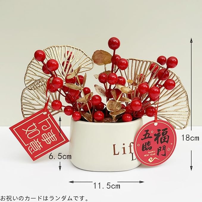 siawadeky 新年飾り 造花 赤いベリー お金の葉 鉢植え 盆栽 お正月飾り 幸運 お金を招く 枯れない植物 クリスマス飾り 縁起のいい 迎春 新春 飾り 引っ越し ギフト 装飾花 花瓶付き お祝いのカード付き
