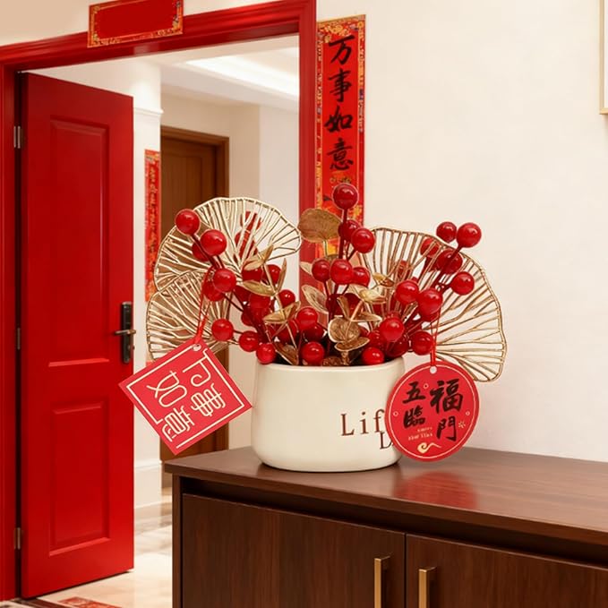 「にぎやかなデザイン」お正月雰囲気満点なお正月造花セットです。赤い実とゴールドの葉が自然的に組み合わせて、この造花セットを作成されています。赤い実は発泡体で作られ、本物の果実のように色鮮やかで、表面に光泽があります。祭りや好みに合わせて、花の枝にお祝いの言葉が書かれたカードをかけることができます。