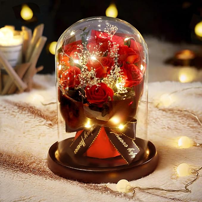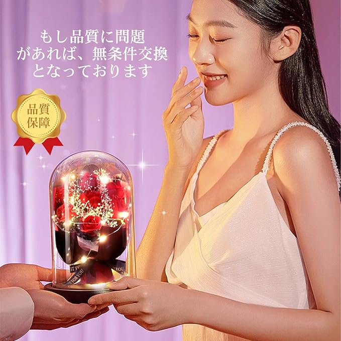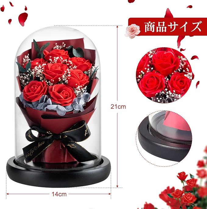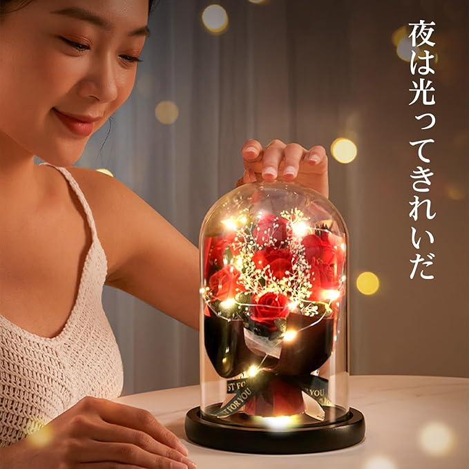 【ガラスドーム設計&電池式】本物そっくりの人工素材で作られ、鮮やかな色と爽やかな香りが半永久的に続きます。そしてLEDライトと透明なガラスを配合して、花の細かいところがよく見えます。電池式なので、携帯便利、どこでも置く可能です。LEDライトは、3個単4電池(含まれていない)によって給電されます。