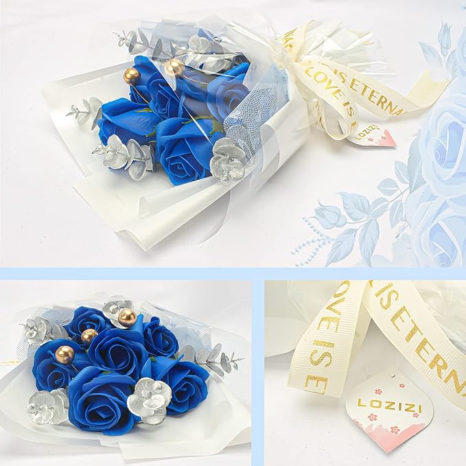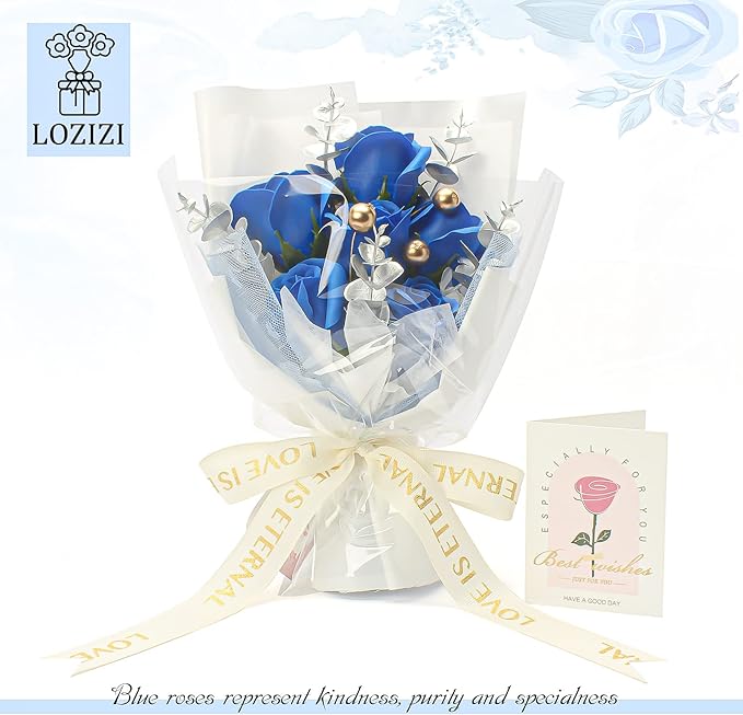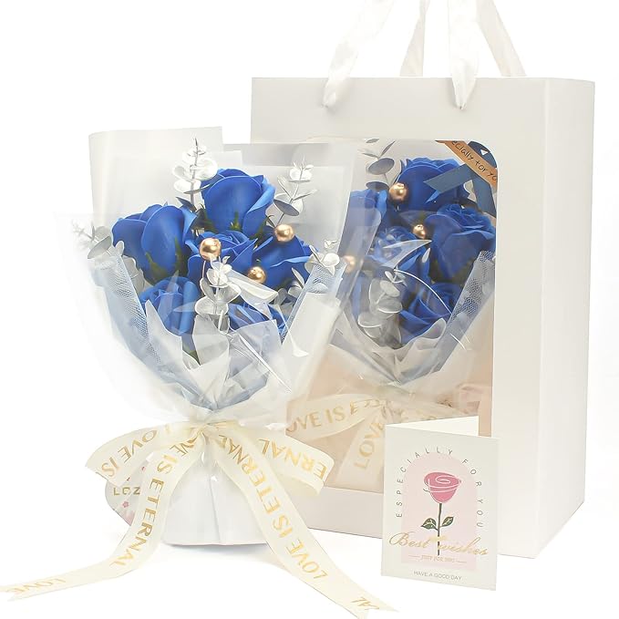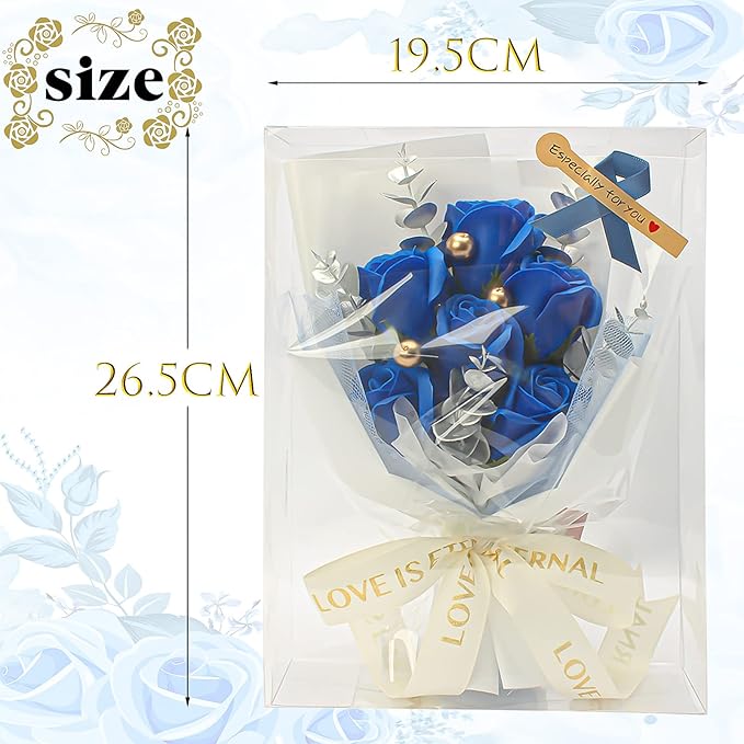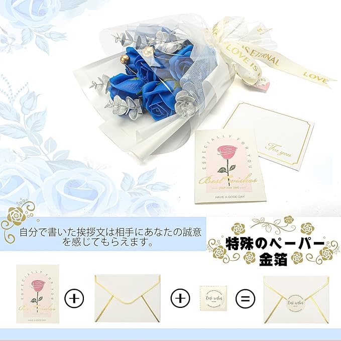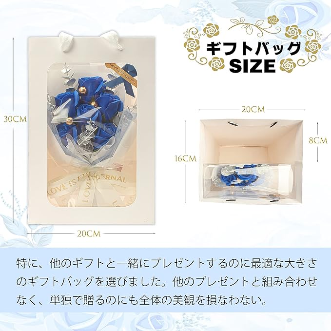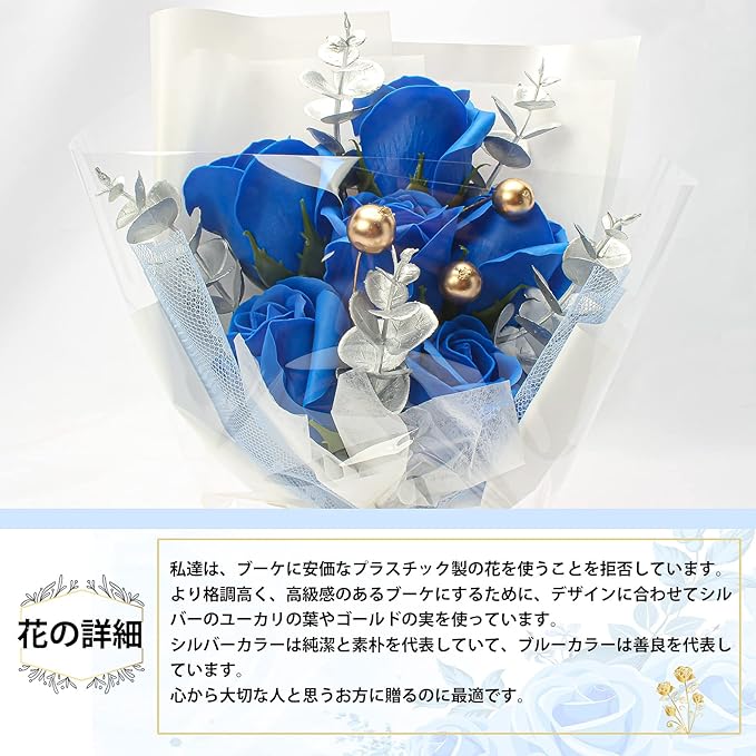ソープフラワー 花束 青いバラ 造花 枯れない花 人気 クリアボックス、メッセージカード付き、手提げ付き