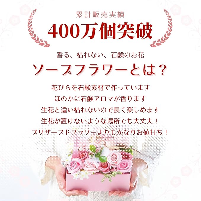 【ソープフラワーの特徴】花びら1枚11枚が石けん素材で作られた観賞用のお花です。プリザーブドフラワーと比べて花弁が大きく、値段がお手頃、石けんのいい匂いがふんわりと香るので人気があります。 生花のように水やりやお手入れの必要がなく、枯れる心配も虫や花粉の心配もありません。