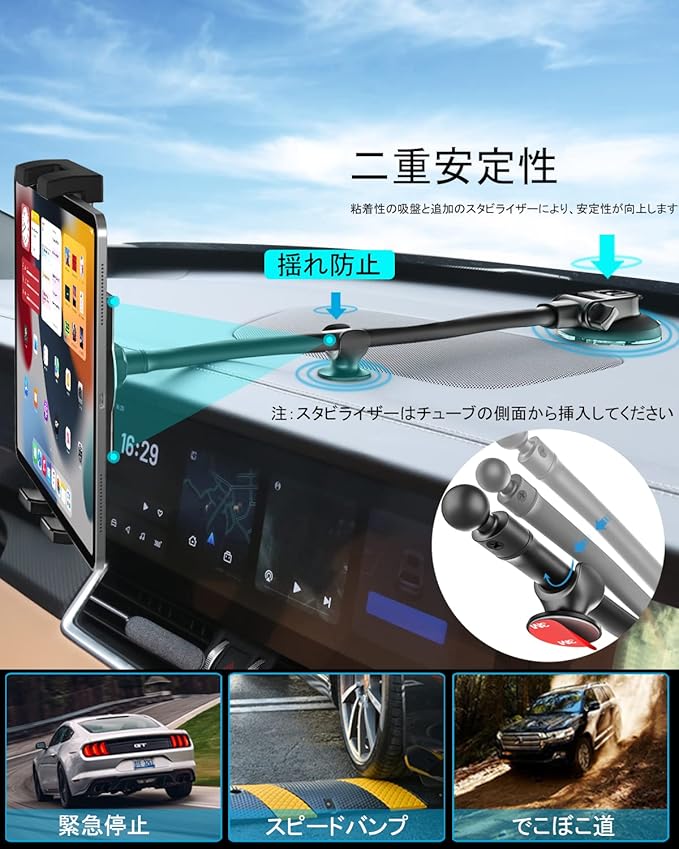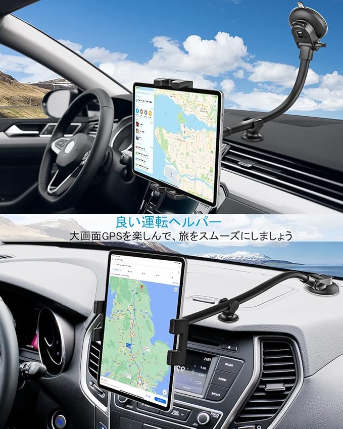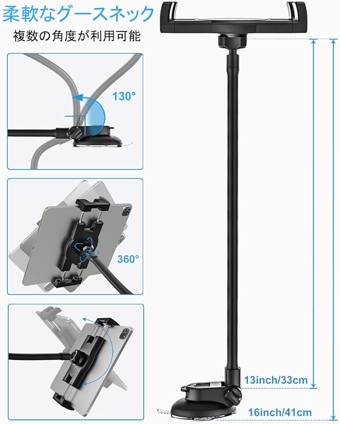 【優れた安定性】吸盤タブレットマウントはプレミアム吸盤ベースを使用しています。ダッシュボードにしっかりと固定でき、強力な吸引力を提供する粘着性のあるサクションカップベースのおかげで、デバイスを常に所定の位置に保つことができます。グースネックアームをしっかりと固定し、デバイスの振動や揺れを防ぐためのスタビライザーが付属しています。33cmの非常に長い、非常に柔軟なアームにより、手の届く範囲でデバイスを簡単に調整し、タブレット画面に簡単にアクセスできます。