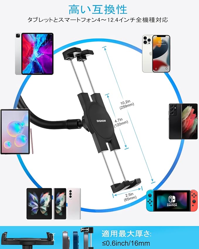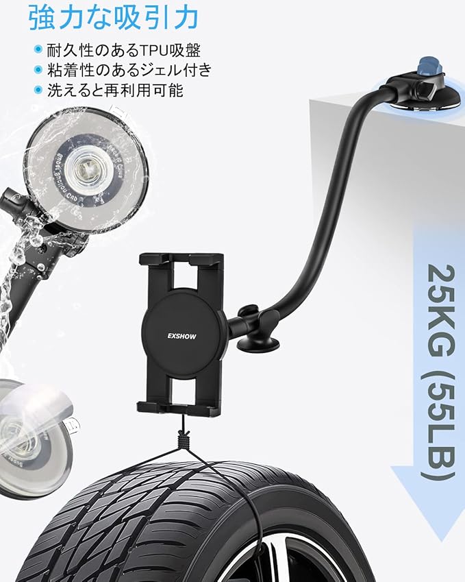 EXSHOW 車載ホルダー ipad スタンド タブレットスタンド 粘着ゲル吸盤 ダッシュボード&フロントガラス 安定性 強力真空吸盤 33cm長いアーム タブレットアーム 柔軟に曲げ 360度回転 日本語取扱説明書 タブレットとスマートフォン4.7~12.4インチ全機種対応 iPad Pro 11 インチ/iPad Air Mini/iPhone/Samsung