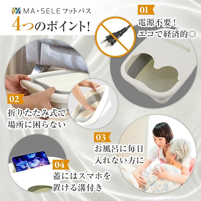 お湯と一緒にお気に入りのエッセンシャルオイルや入浴剤を混ぜるとより一層リラックスできます。フタにある窪み部分にスマホやタブレットを立て掛けることで、動画鑑賞やゲームも同時に楽しめます。自宅はもちろん、アウトドア・介護・災害時などすぐにお風呂に入れない環境でも身体を癒せるグッズです。