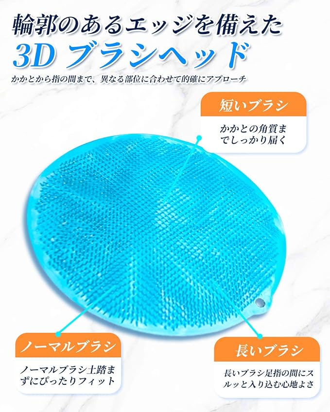 【優しく角質・足臭を除去】この足洗いブラシは泡立ちに優れ、柔らかく細密なブラシ毛が足の指の間まで入り込み、汚れが残りやすい部位を効果的に清掃し、清潔を保ちます。3D 構造のブラシは足のあらゆる角落まで深く清掃可能!厚い角質や足の異臭を除去できるだけでなく、足裏の肌にも心地よい刺激を与えます。