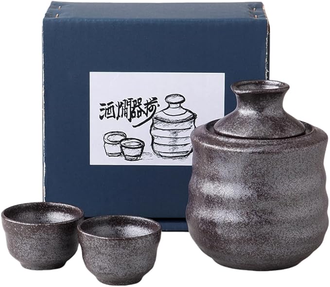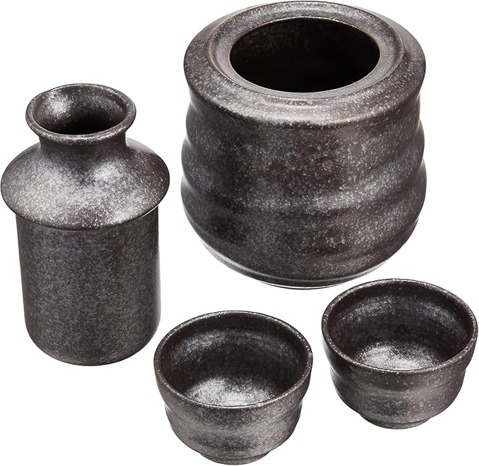 サイズ:徳利 1/径6 高10.2cm 140ml、燗冷器 1/径9.4 高9.2cm、盃 2/径7 高4.6cm