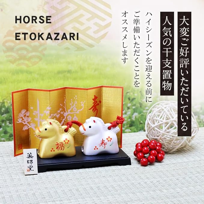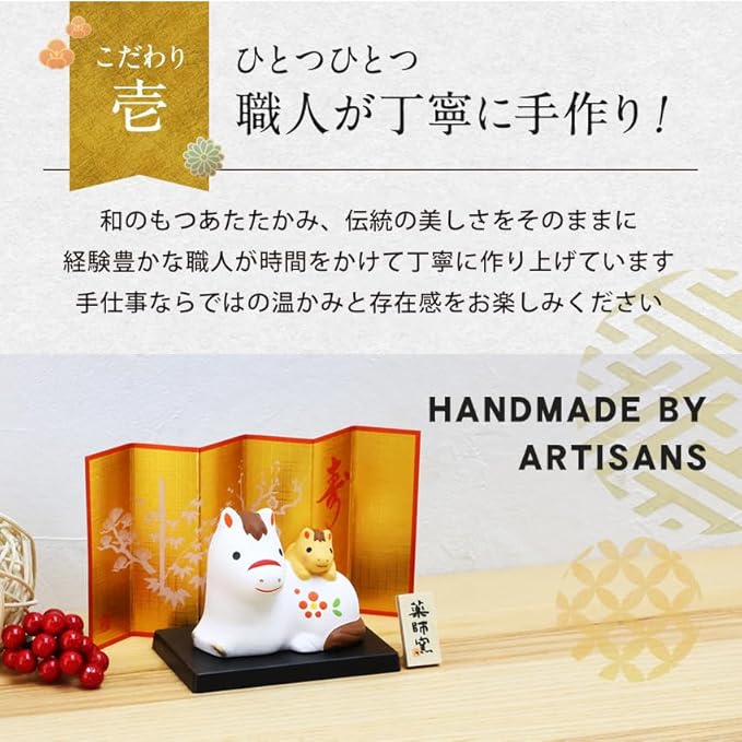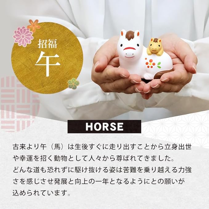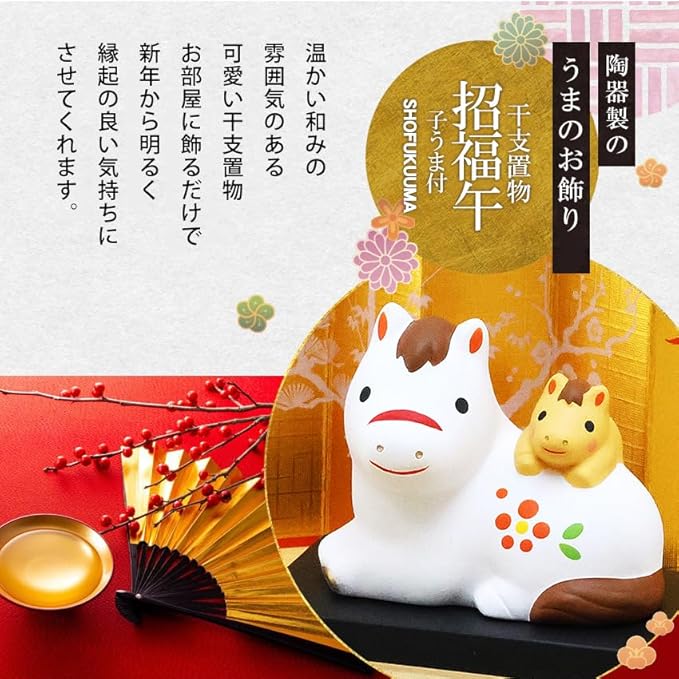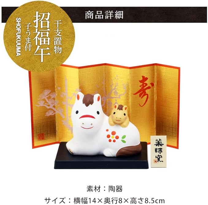 大阪長生堂 干支飾り 干支置物 午 馬 ウマ うま 十二支飾り 正月飾り 陶器 オリジナル木札無料特典付(別送) 子うま付