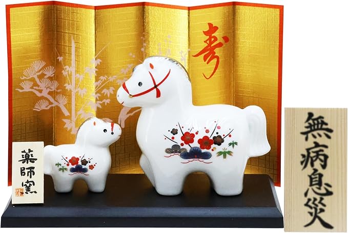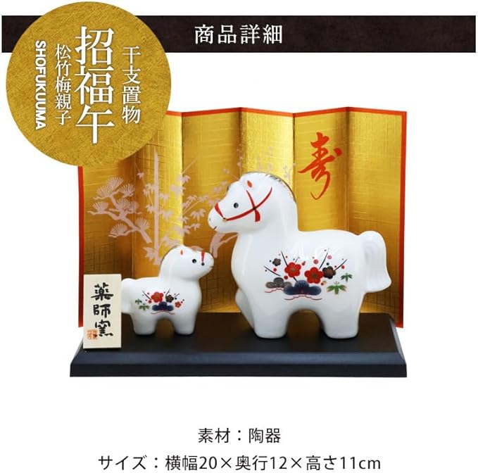 大阪長生堂 干支飾り 干支置物 午 馬 ウマ うま 十二支飾り 正月飾り 陶器 オリジナル木札無料特典付(別送) 松竹梅親子