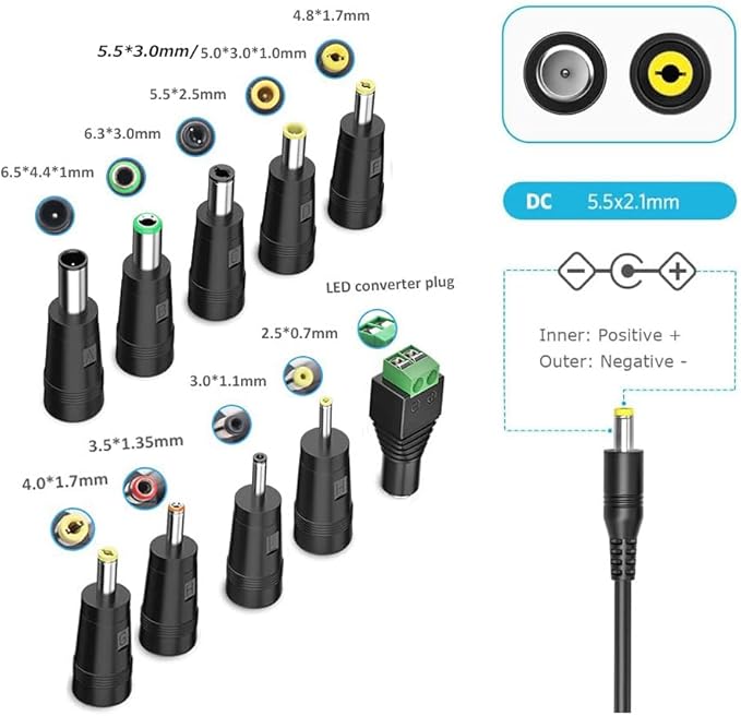 「マルチコネクタ」さまざまなコネクタを選択し、ほとんどの12V DC充電デバイスに電力を供給できます。 より多くの電力の選択肢を提供します。 コネクタサイズ:A- 6.0*4.4mm、B- 6.3*3.0mm、C- 5.5*2.5mm、D- 5.5*3.0mm、F- 4.8*1.7mm、G- 4.0*1.7mm、L- 3.0*1.0mm、H-3.5*1.35mm、I- 2.5*0.7mm、LED端子プラグ。外径:5.5mm、内径:2.1mm(本体) 、 DCケーブル長さ:1.5m。
