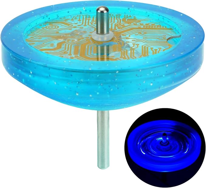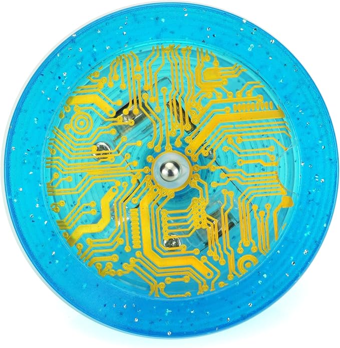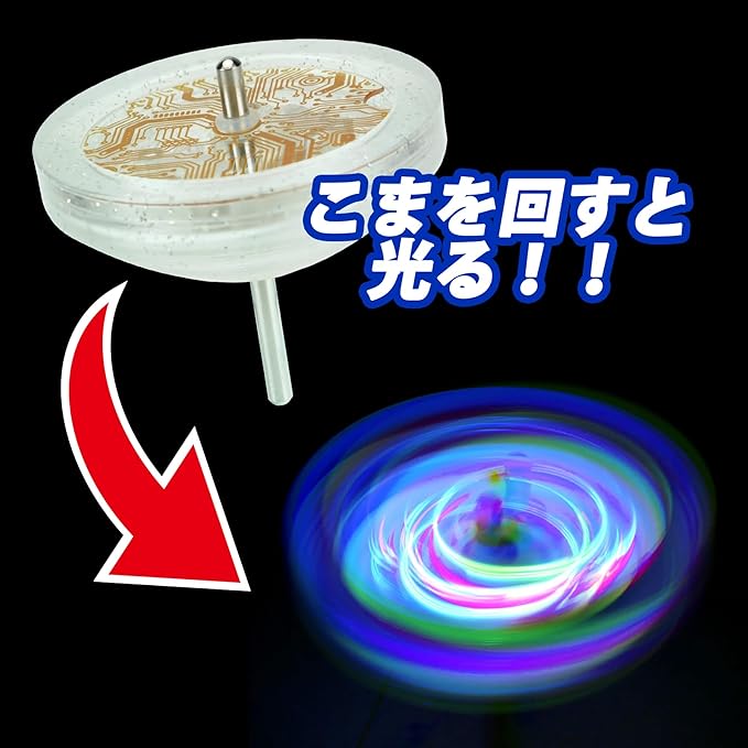初めてのお子様でも回しやすいコマ世界大会認定こま ヒバリに光る回路を追加。地面でのこま回しがメインの遊び方になります。ある程度強く回転をかけるとLED回路が色鮮やかに光ります。