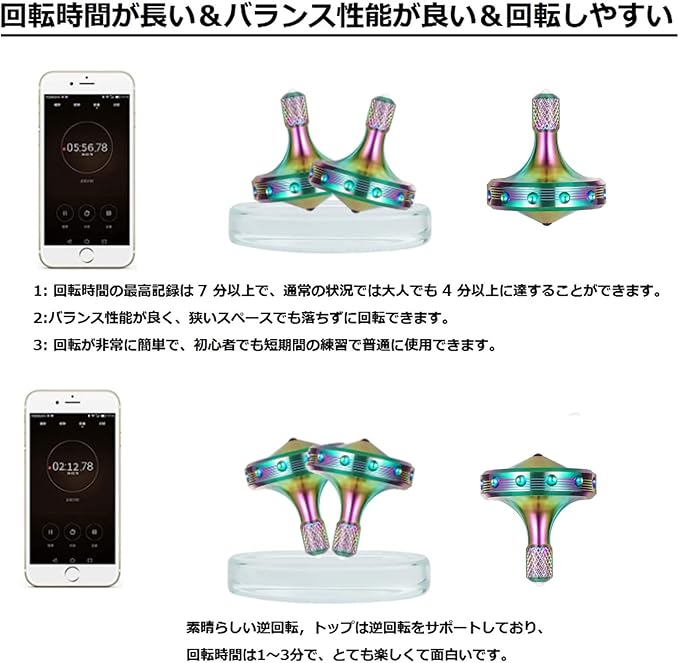 √ シンプルで実践的なスキル: 経験に基づく 、ほとんどの人の習慣に合った練習テクニックを提供します。 親指と中指を使ってトップの上部をしっかりと持ち、トップを地面(トップシャーシ、ガラス、またはセラミックタイルでも構いません)に対して垂直に、地面から1〜3 cmの位置に置き、平行に回転させます。 回転時間とバランスは力の大きさと方向によって決まります。 最高の結果を達成するには練習が必要です。