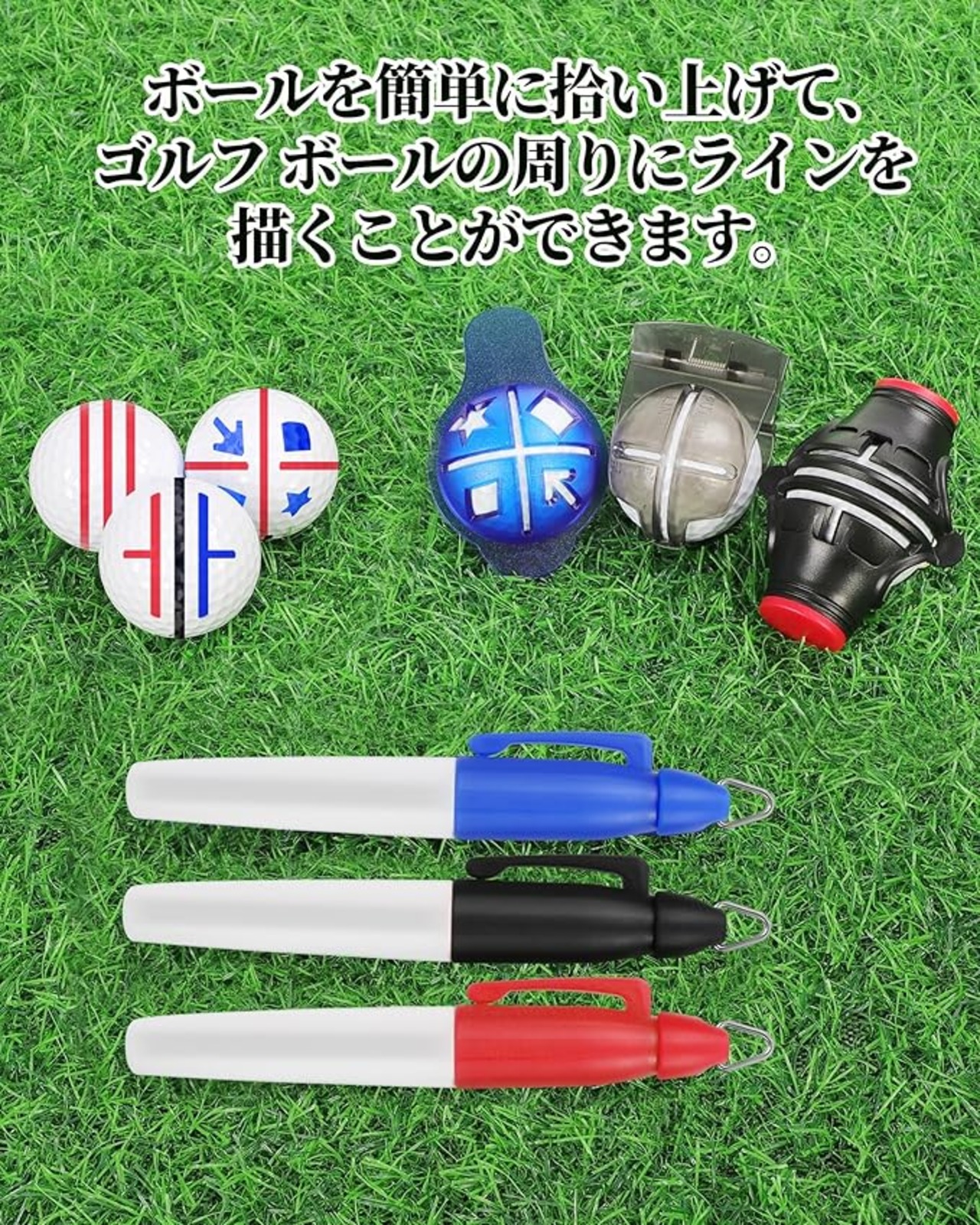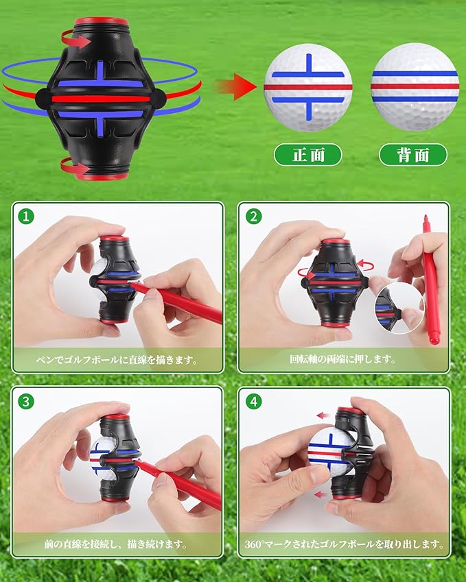 ゴルフボールマーカー 180 360 ボールラインマーカー 簡単に線が引ける 持ち運び便利 ゴルフ場/自宅/室内/屋外 6点セット (マーカー*3個+ペン*3本) 黒赤