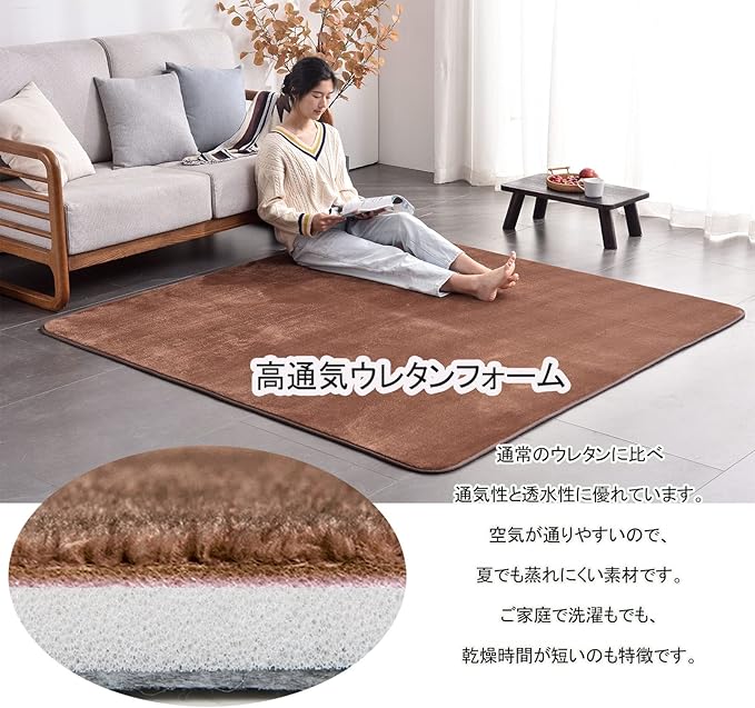【低反発・分散体圧】この低反発ラグの表面は高密度で良質なフランネル生地を採用しており、ラグの中材には通気性がよいウレタンフォームを採用して、厚さ約10mm、総厚さ約15mm。厚手カーペット踏み心地が良く、転んでもとても柔らかい感じがするのが特徴だ。このカーペットは体圧分散できます、長時間座っても疲れにくい。
