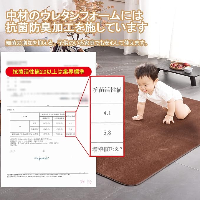 【抗菌防音】この厚手低反発カーペット通気性に優れ、抗菌活性値指数が高い、良い抗菌防ダニ効果。お年寄りやお子様がいるご家庭でも使えるラグです。また、子供がいる家庭では厚め低反発ラグが下の階の防音効果と防音効果を予防する。