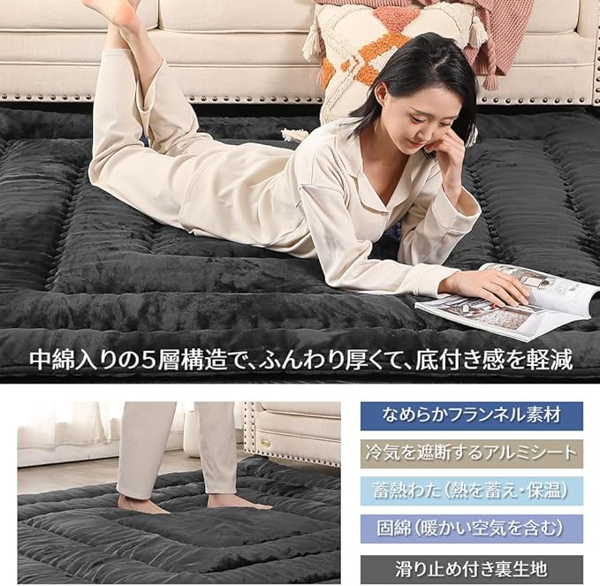 【滑り止め加工&防音効果】裏地は滑り止め加工が施されているので、フローリングに敷いても滑りにくく、お子様やお年寄りのいるご家庭でも安心してお使いいただけます。固綿入りの5層構造で階下への音を軽減します。床暖房・ホットカーペットにも対応します。