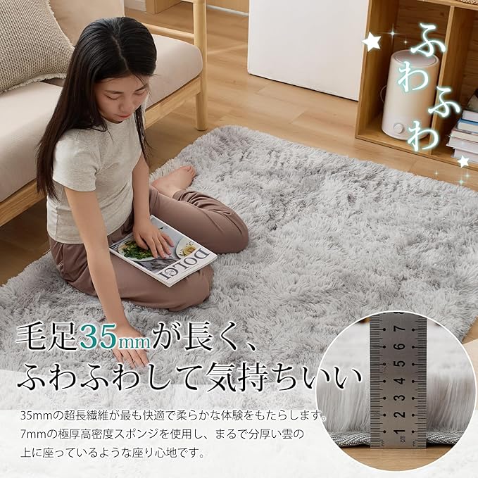 【商品仕様】サイズ:185x185cm 表地:ポリエステル100% 中材:ウレタンフォーム 裏地:ポリエステル100%。 起毛の高さ:約35mm、ウレタン厚:約7mm、不織布と滑り止め加工は約2mm、合計厚さ約45mmです。