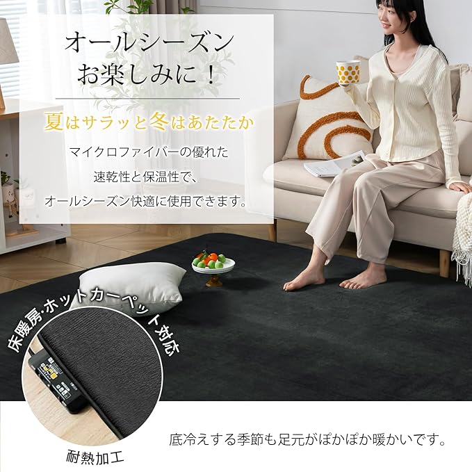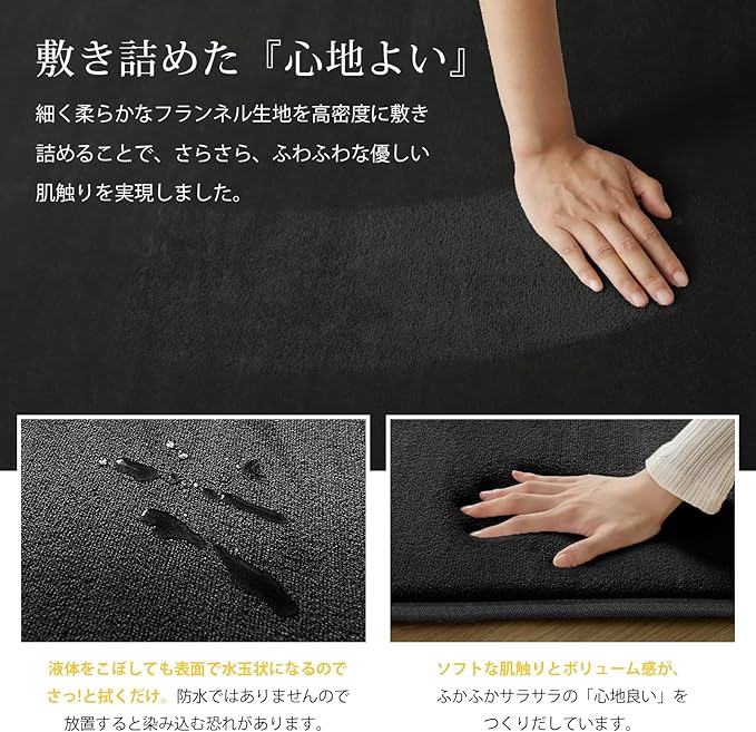 【オールシーズンお楽しみに】絨毯表面は細く柔らかなフランネル生地を高密度に敷き詰めることで、さらさら、ふわふわして優しい肌触りを実現します。極細マイクロファイバーは軽くて、保温性や速乾性も優れているので、夏はサラッと冬はあたたかい!床暖房・ホットカーペットも対応し、底冷えする季節も足元がぽかぽか暖かいです。