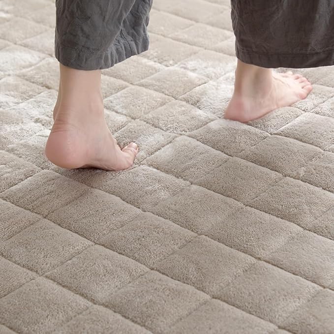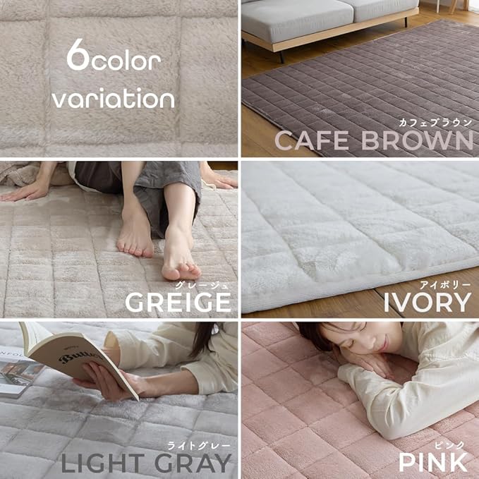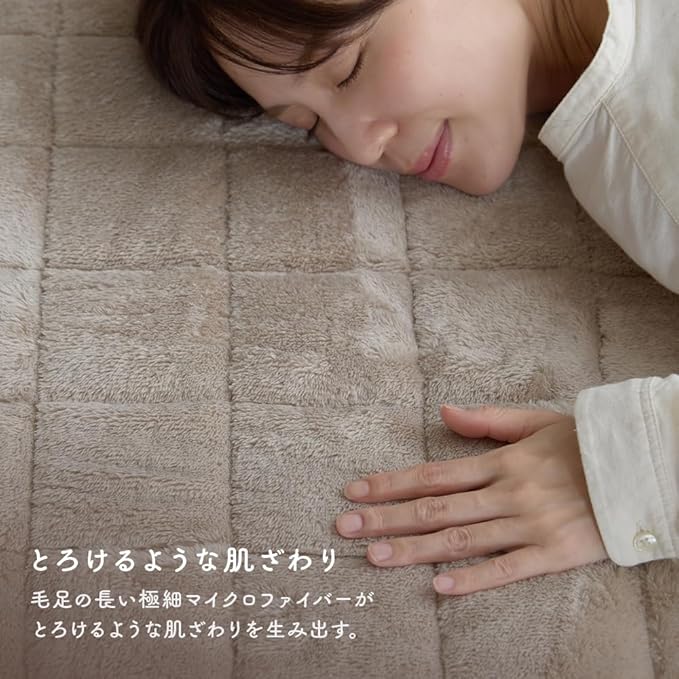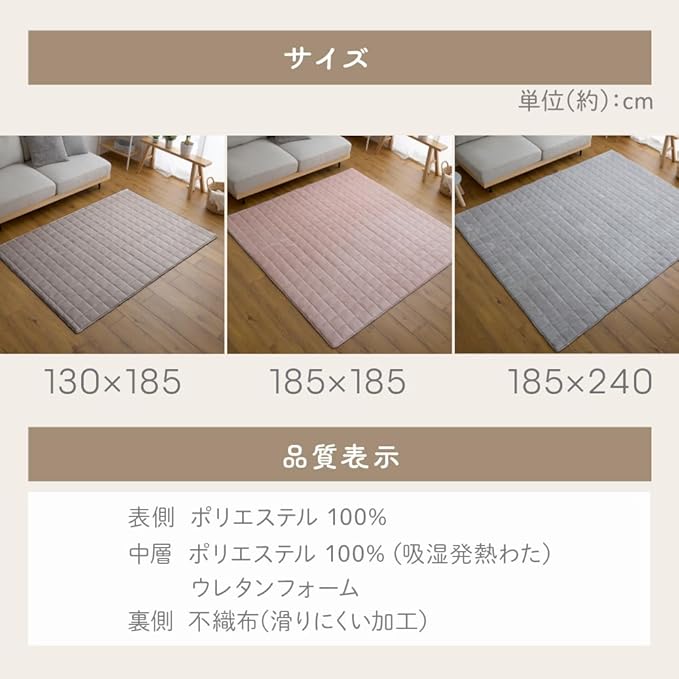 材質 表:毛羽部分:ポリエステル100%(フランネル長毛マイクロ330g/m2) グランド部分:ポリエステル100% 中綿:ポリエステル100%吸湿発熱綿 洗えるウレタン20D 10mm 裏:不織布滑り止め付き